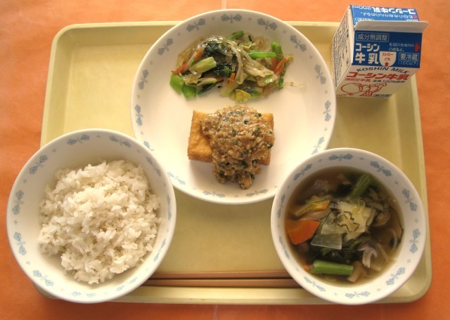 二之江中では、具を混ぜたごはんより、白ごはんが人気な傾向にあります。今日、各クラスをのぞいてみても、ごはんを山盛りお代わりしている様子をよく見かけました。白ごはんと合わせるのに向かなさそうなあっさり味の厚揚げも、味付け濃いめで美味しい肉みそをかけると、ごはんのはかどるおかずに早変わり。味がたんぱくな分、合わせるものを選ばない厚揚げは、みそ汁や丼の具など、様々な給食に登場しています。歯ごたえがあり、よく噛んで食べる力を鍛えるのにも役立ちます。