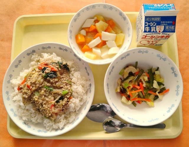 今日はいつもとは一風変わった中華そぼろ丼です。ひき肉を香味野菜で炒め、人参、玉葱、大豆などと合わせてみそ味にととのえました。ごまがしっかりきいた、コクのある味わいに仕上がっており、教室でもご飯がすすんでいる様子でした。濃厚な丼の具とさっぱりしたフルーツ杏仁との相性がよく、どちらもお代わりの人気がありました。嫌われがちな茎わかめにもファンがいて、サラダを山盛りにする様子も……。食べやすい中華の味付けを通じて、少しでも挑戦してもらい、苦手に思う生徒が減ればと願っています。