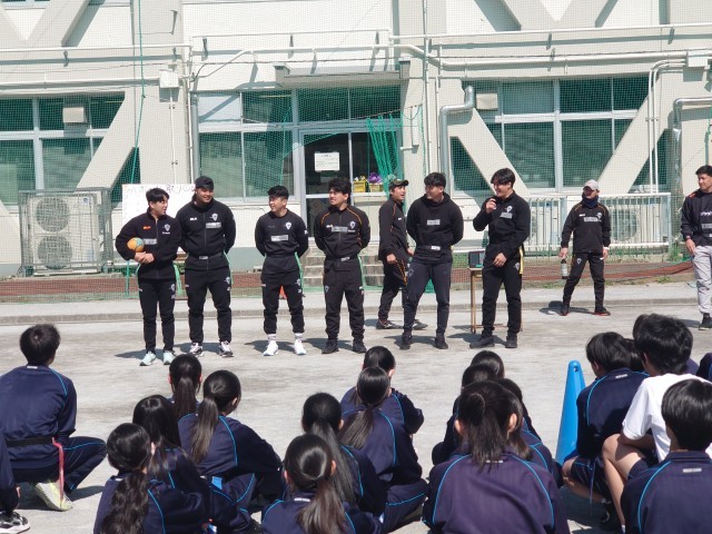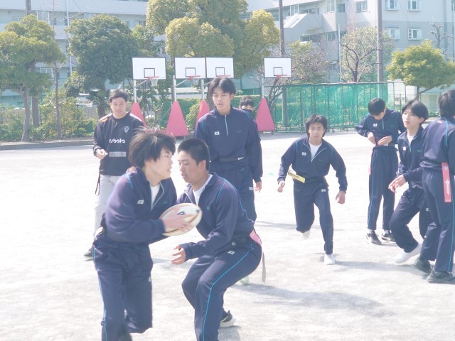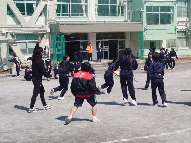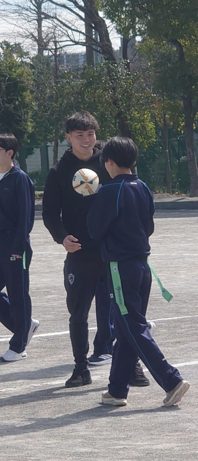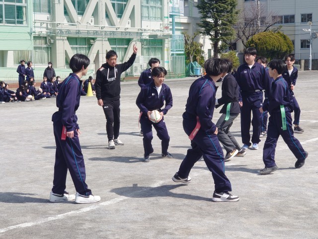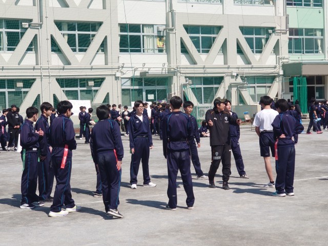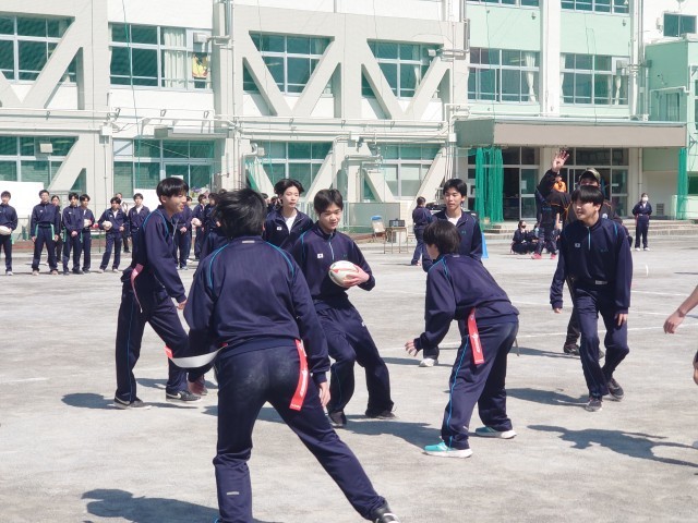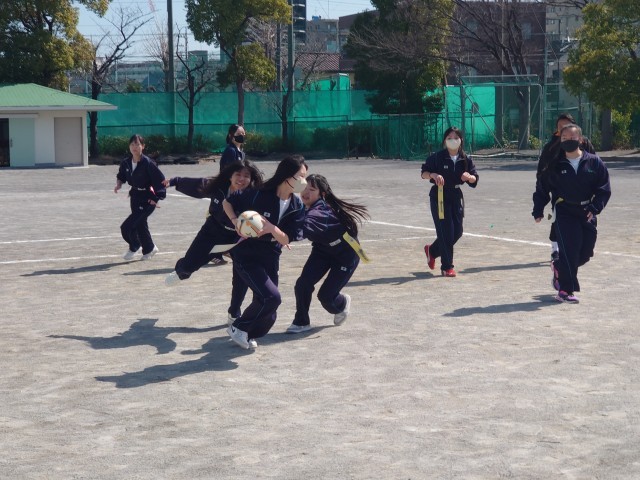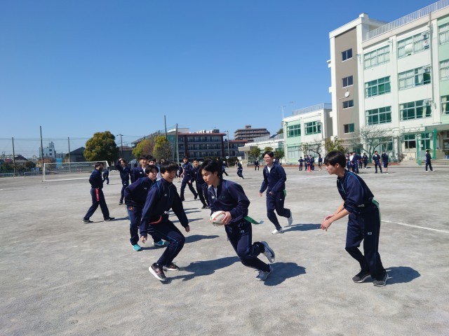 今日はクボタスピアーズの選手&スタッフの方々12人が、タグラグビー教室で来校しました。現在ラグビーのプロリーグであるリーグワンで首位を走る選手からシーズン中にも関わらず熱心にご指導していただきました。3年生は初めてのタグラグビーで、最初はどう動いていいか戸惑ってる様子もありましたが、試合を重ねるごとに動きもスムーズになり、突進とパスワークを駆使しながら、ナイスゴールがたくさん生まれました。卒業を間近に控える3年生にとって、最高の思い出になったら良いです。