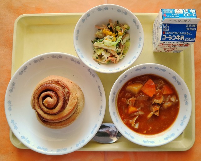 今日で今学期の給食も最後となりました。最後の給食も美味しく食べてもらえるよう、給食室ではいっそう張り切って手作りパンを作りました。ほのかな甘みとほんのりシナモンの香りがする手作りパンは、きれいにロールした見た目の愛らしさも味も良く、もちもちの生地は食べ応えばっちり。じゃんけんは白熱し、お代わり券をこの日のためにとっておいた生徒もいるほどの盛り上がりでした。まるで切り札のようにお代わり券を出し、見事にパンを勝ち取った生徒は満足げで、楽しみにしていた気持ちが伝わってきます。