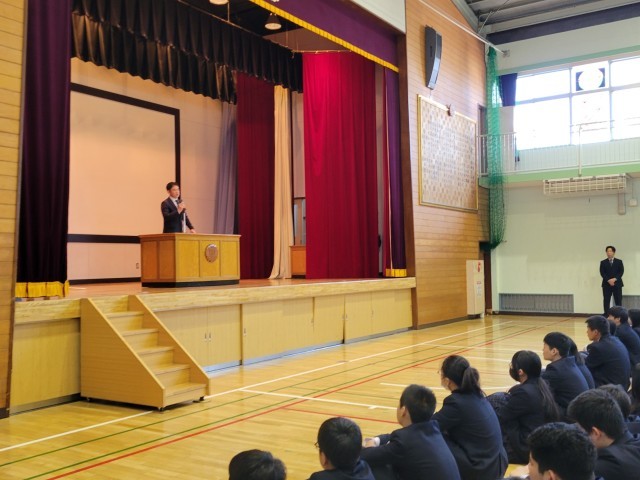 まず、異動されてきた先生方を紹介する『着任式』が行われ、その後、始業式が行われました。