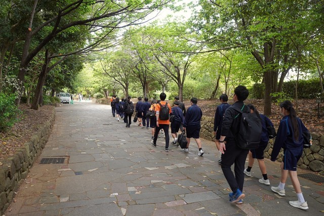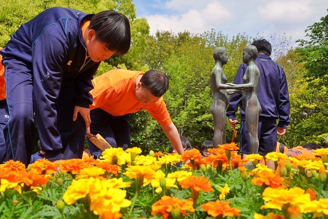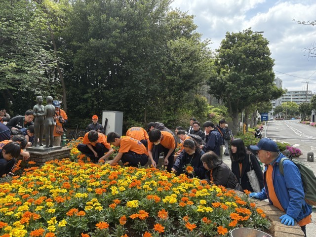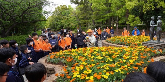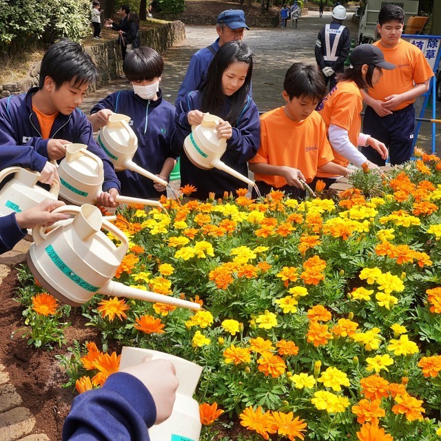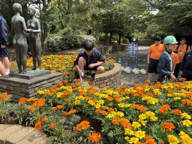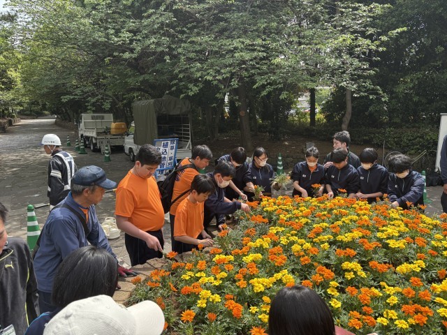 ラグビーの観戦前に7組では、スタジアム周辺にスピアーズカラーの植樹ボランティアを行いました。綺麗なお花が試合前の雰囲気を盛り上げていました。