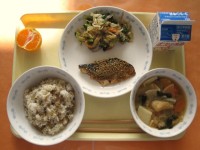 五目とりめし・鰆の西京焼き・牛乳・沢煮椀・フルーツあんみつ