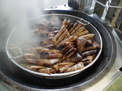 もともとは中国の風習で、難をさけるといわれる「レンジュの葉」でちまきを作っていたそうです。給食では竹の皮を使ってちまきを一つ一つ手作りしました。