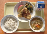 麦ごはん・牛乳・めばるの甘酢あん・小松菜としらすのポン酢和え・じゃがいもの呉汁