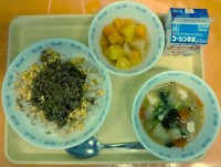 【献立】豚そぼろの五目ちらし寿司 牛乳 じゃがいものみそ汁 桃のフルーツポンチ ...