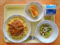 【献立】ツナのトマトクリームスパゲティ 牛乳 鶏ささみのさっぱりサラダ パインケ...