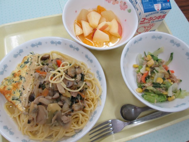 栗入りきのこボンゴレスパゲティ 小松菜のフリッタータ ツナサラダ フルーツポンチ(秋仕立て) 牛乳