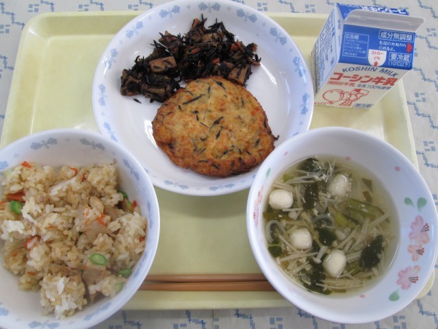 蓮根と鶏肉のごはん 豆腐の真砂揚げ ひじきの炒め煮 吹雪汁 牛乳