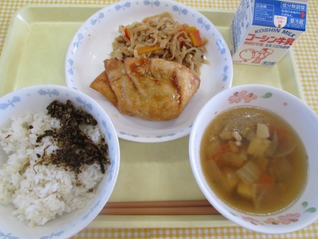 麦入りご飯(明日葉ふりかけ) 鰺の揚げ餃子 切干大根の炒め煮 五目汁 牛乳