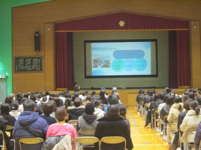 説明会では、本校の教育課程や生活の決まり、中学校の学習などについて話をしました。