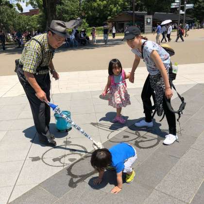 【写真下】上野公園では、パフォーマンスもたくさん見られました。子どものリクエストにこたえて、水で絵をかいていました。