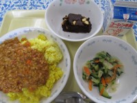 大豆ミートのキーマカレー 小松菜サラダ ココアケーキ(栗入り) 牛乳