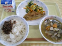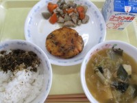 ごはん(エコふりかけ) 小松菜いももち 根菜の煮物 白糸だらの味噌汁 牛乳