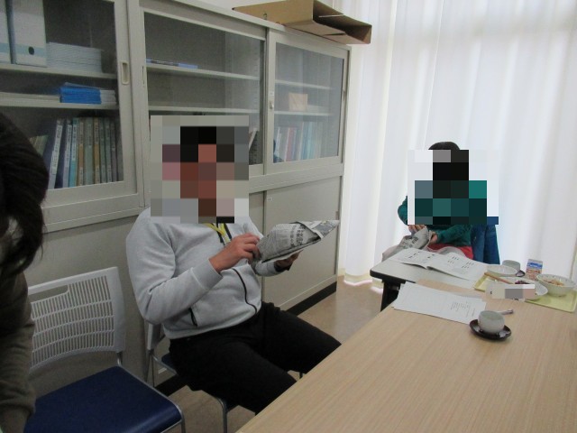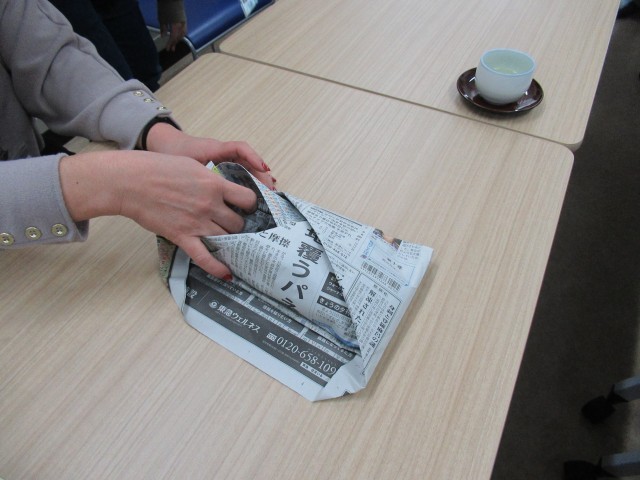保健委員会の生徒たちによるプレゼンテーションと災害時に使うことができる新聞紙を使ったスリッパ作りのレクチャーがあり、ご参加いただいた皆さんと一緒に作ることができました。