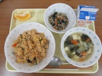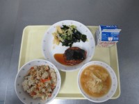 【献立】かやくごはん牛乳れんこんとひき肉の磯辺揚げいかとわかめのからしあえ大根の...