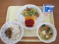 【献立】西湖豆腐丼(シーホー豆腐丼)牛乳大根とじゃこのサラダ青菜のスープ西湖豆腐...