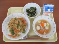 【献立】キムチチャーハン牛乳小松菜とひじきのナムルわかめスープ巨峰ナムルは、野菜...