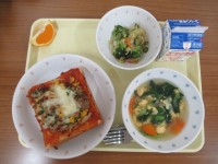 【献立】ピザトースト牛乳オニドレサラダ小松菜とたまごのスープ清見オレンジピザはイ...