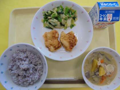 ゆかりごはん 牛乳 キスの長崎天ぷら または 大分県のとり天 キャベツの辛し和え 鶏ごぼうの呉汁
