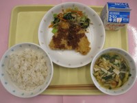 スパゲティチキンソース 牛乳 マカロニサラダ アーモンドキャラメルポテト