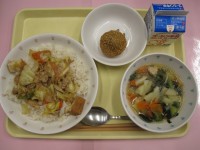 ハニーレモントースト または メープルトースト チーズトースト 牛乳 タラと豚肉のトマトシチュー ツナサラダ バナナ