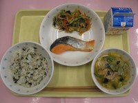 【全国学校給食週間献立】わかめごはん牛乳サケの塩焼きキャベツのおかか和え豆腐すい...