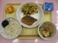 【みんなの給食~節分献立~】福豆ごはん牛乳いわしのさんが焼ききつね和え千切り野菜...