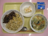 ごはん牛乳厚揚げの肉みそかけ春雨と小松菜の炒め物いろどり汁