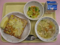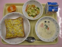 マヨコーントースト牛乳花野菜のシチューマカロニサラダみかん