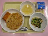 鮭とたまごのチャーハン牛乳レバーのごま中華揚げワンタン入り中華スープみかん入り牛...