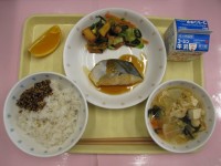 ごはんごま昆布ふりかけ牛乳さわらの照り焼き小松菜と揚げあさりのピリ辛和え豆腐と麩...