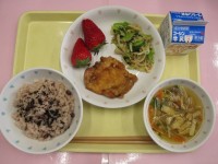 【卒業お祝い給食】赤飯牛乳鶏肉のレモン醬油がけツナのからし和え沢煮椀いちご