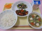 今日は中国の料理です 家常豆腐丼 牛乳 蛋花湯(中華卵スープ) オレンジ寒天ポン...