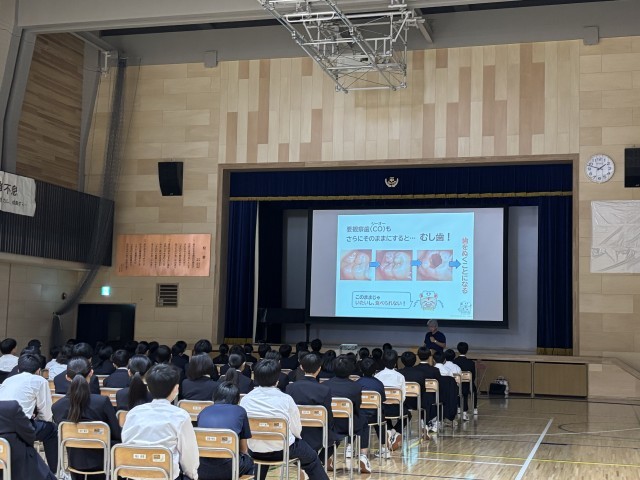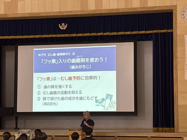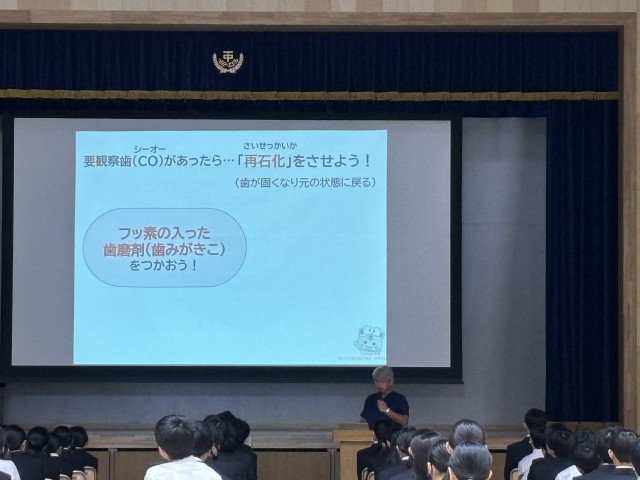 校医の片上先生から、歯科講話が一年生に向けて行われました。むし歯や歯周病はなってしまうと自然には治りません。毎日の正しい歯磨きや食習慣と定期的な歯医者への受診でむし歯にならないようにしなくてはなりません。明日歯ブラシ(全校)、歯間ブラシ(一年生のみ)が配られます。ぜひ習慣化し、予防に励み2:1:1(2㎝ ・キャップ1杯・週一回のフッ化物洗口)の法則でしっかり歯を磨きましょう。