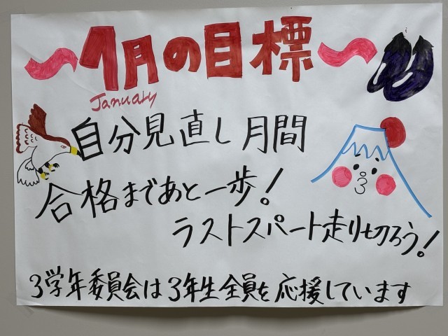 明日から私立の推薦試験がはじまります。今までやってきたことを精一杯発揮して自分を信じて頑張ってきてください。一中みんなで応援しています。