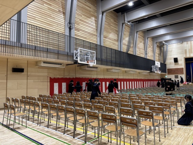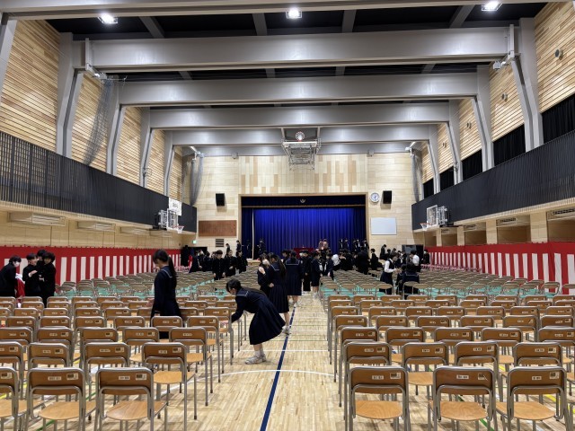 明日はいよいよ第79回卒業式。全校で式場の準備をしました。心を込めてお世話になった先輩たちを送る準備です。新校舎になって初めての屋内運動場での卒業式です。一中の歴史に刻まれることでしょう。第79回卒業生のために準備をみんなでしました。それは皆さんが今までしてくれたことへの恩返しだと思っています。明日はその勇姿を後輩達に見せてください。