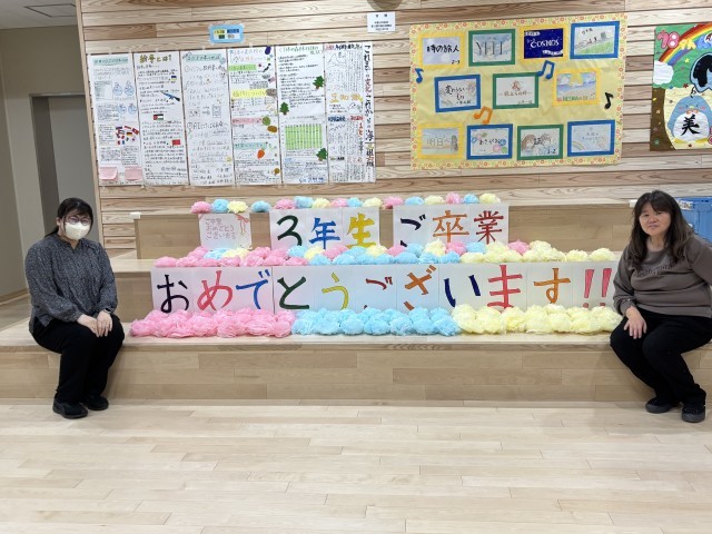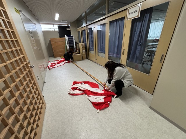 式場の準備にたくさんの人の思いが詰まっています。紅白幕の準備、会場の清掃、新しい校舎の特性をいかした屋内飾り。明日はその全てが3年生へのはなむけです。ご卒業おめでとうございます!
