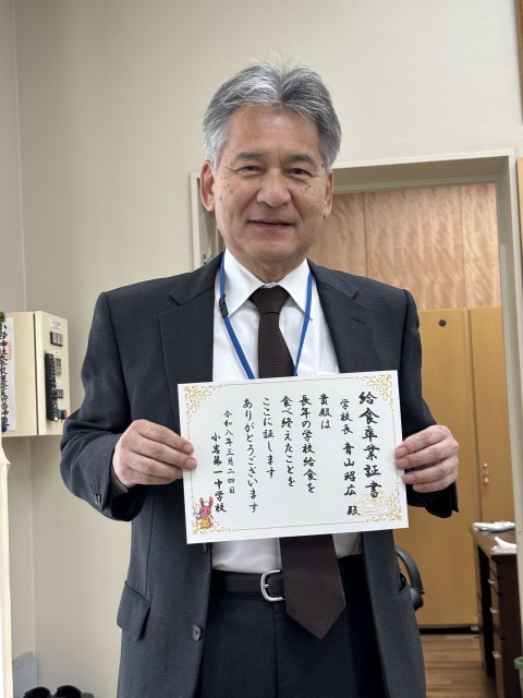明日は令和7年度の締めくくり、修了式です。1年間本当によくがんばりました。小さかった1年生も心も背丈も大きくなり立派になりました。2年生は3年生が卒業した後の朝礼でも3年生がいない事を忘れてしまうほど最高学年の表情を見せていました。わずか2週間しかない春休みですが、その春休みを越すともうひと学年進級です。どんな先輩たちになるのか楽しみです。新しく入ってくる新1年生の小学校の卒業式に行ってきました。厳かな素敵な式でした。一中に入学してくるのを待っています!と声をかけました。