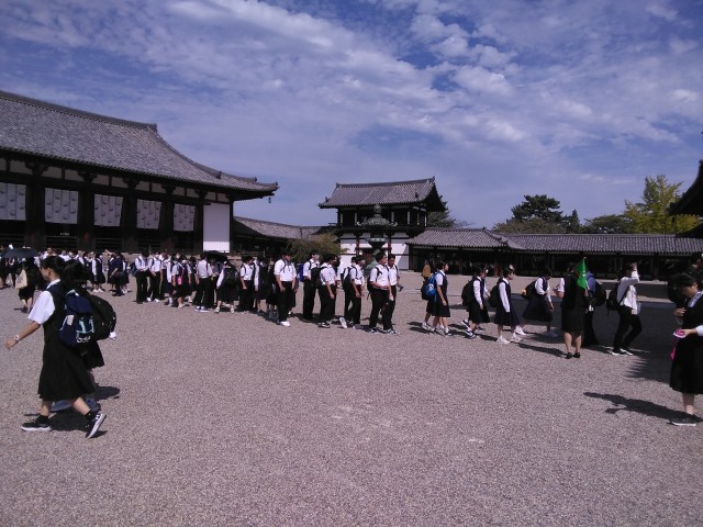 法隆寺の見学の様子です。クラスごとにガイドさんの説明を聴いています。