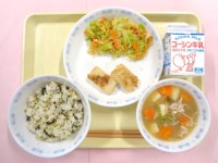 ごはんごまじゃこ小松菜ふりかけ飲用牛乳とり肉と豆腐のつくね揚げ茎わかめと切り干し...