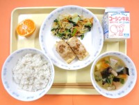 五目うどん飲用牛乳じゃが餅揚げもやしと茎わかめのごま酢和えみかん761kcal