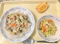 ◯牛乳◯豚塩野菜炒め丼◯チョップドサラダ◯国産ネーブルオレンジ3年生が家庭科の食...
