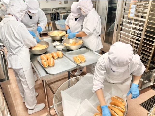 こまツナドッグは790個ものパンに小松菜入りのツナサラダを一つ一つ挟んでいきます。調理師さんも分担して作業しながら、大体4~5人で全校分を挟みます。