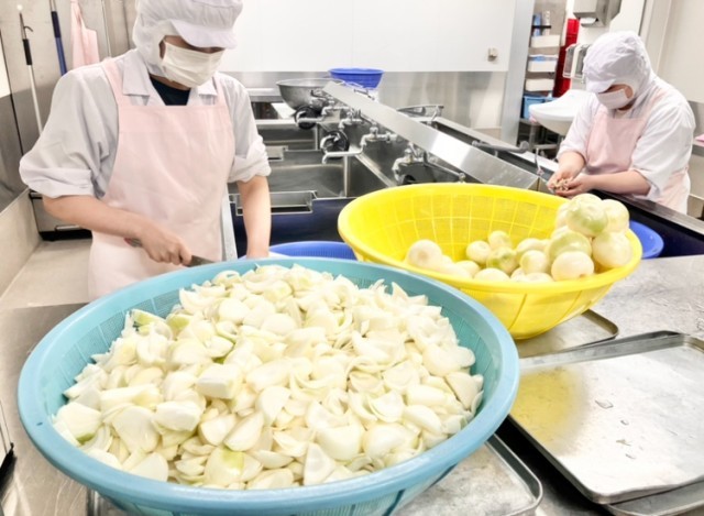 シチューは野菜をたくさん入れてもしっかり食べてくれるので普通のサラサラした汁物よりもたくさん野菜を入れています。切るものもとても多いので給食室は朝から大忙しです。