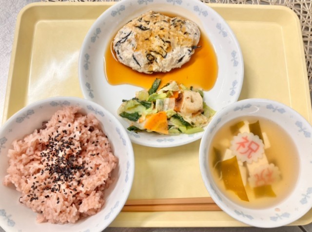 今年度で3年目を迎える小松川中学校の開校記念日は「10月3週目の土曜日」です。今年は開校記念日が文化祭と同日なので、週の初めの本日を開校記念のお祝い献立にしました。お赤飯と合うように和風ハンバーグには出汁をきかせた甘醤油あんをかけて提供します。お赤飯のささげが苦手な人もいますが、日本では古来より赤い色には邪気をはらう力があると考えられており、お祝い事の際には神様に赤米を炊いて供える風習がありました。 庶民の多くは赤米を江戸時代になる前頃まで食べていましたが、稲作技術の発展による品種改良で、味が良く収量が安定する現在のお米に変わっていきます。しかし、赤い色のご飯を供える風習は根強く残っていたので、江戸時代中期の頃、代用品として白いお米を小豆で色づけしたものがお赤飯として広まったそうです。日本で昔から「ハレの日」に食べられてきた赤飯です。ごま塩をかけて、召し上がれ。