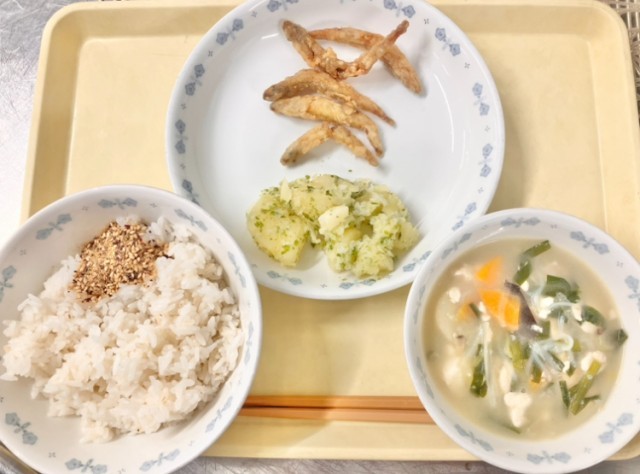 わかさぎは頭からしっぽまで、骨ごと食べられる小魚なので歯や骨のもとになるカルシウムが豊富です。今日はにんにくと生姜をきかせた醤油に漬け込んで下味をつけ、カリッと揚げました。さて、わかさぎは漢字では「公魚」と書きます。これは江戸時代に麻生藩の藩主が徳川家にわかさぎを献上したところ、大変喜ばれ、以降献上が続けられるようになり「御公儀の魚(徳川家御用達の魚)」とされたことに由来しています。徳川家康は当時の人としてははかなりの健康長寿だったそうです。わかさぎを始めとする色々な献上品を少しずつ食べていたことが、健康長寿の秘密かもしれませんね。
