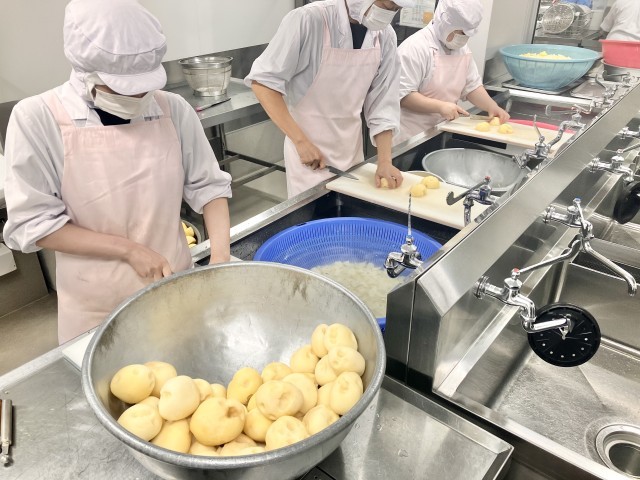 今日使ったじゃがいもの総量は58kg!! 3人がかりで朝から切っても、切るだけで1時間半くらいはかかります。火の通りが均一になるように、きれいに切り揃えます。