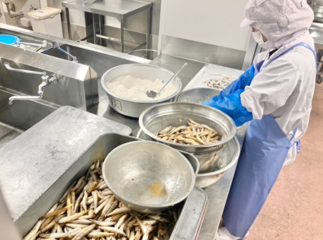 キラキラ輝くわかさぎに、衣を薄くつけていきます。衣は薄くつけることで揚げたときに剥がれにくくなり、しかも吸油率を下げることができます。