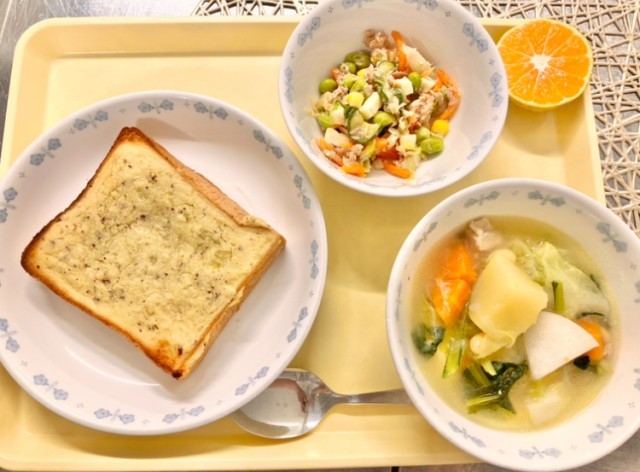 丸ごとおさつトーストは新メニュー♪さつまいもを皮ごと使い、秋らしい色合いと食物繊維がしっかり摂れるように工夫しました。柔らかくなるまで加熱してから豆乳でのばし、少量の砂糖で甘みをつけてペーストにしました。ほんのり焦げ目がつくまで焼くことで焼き芋のような風味に仕上がっています。ポトフは「このスープ、汁がないです。」と言われることがありますが、フランス語で「火の上の鍋」を意味する洋風の煮物です。肉も野菜もたっぷり入れて、野菜の甘さ引き立つ優しい味を目指しました。急に寒くなって体調を崩しやすい時期です。しっかり食べて、早寝早起きで体調を整えましょう。